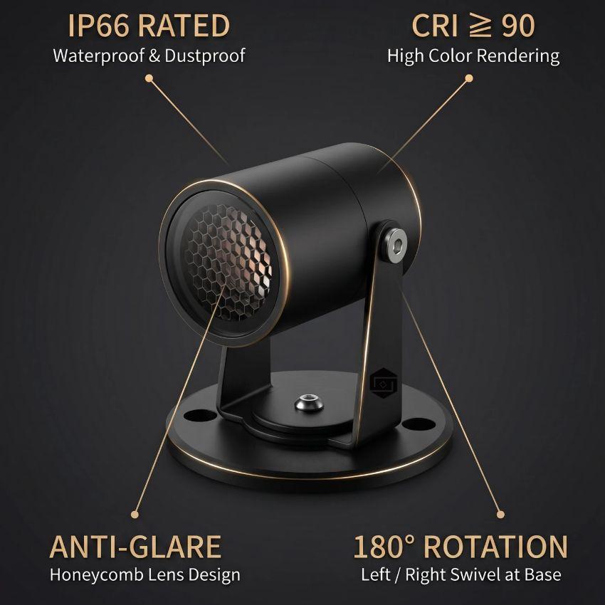 With a Color Rendering Index of 90 or above, this spotlight faithfully reproduces the true colors of every surface it illuminates —from the rich textures of natural stone walls to the vibrant greens of tropical foliage. Every detail comes alive under its warm, accurate light.